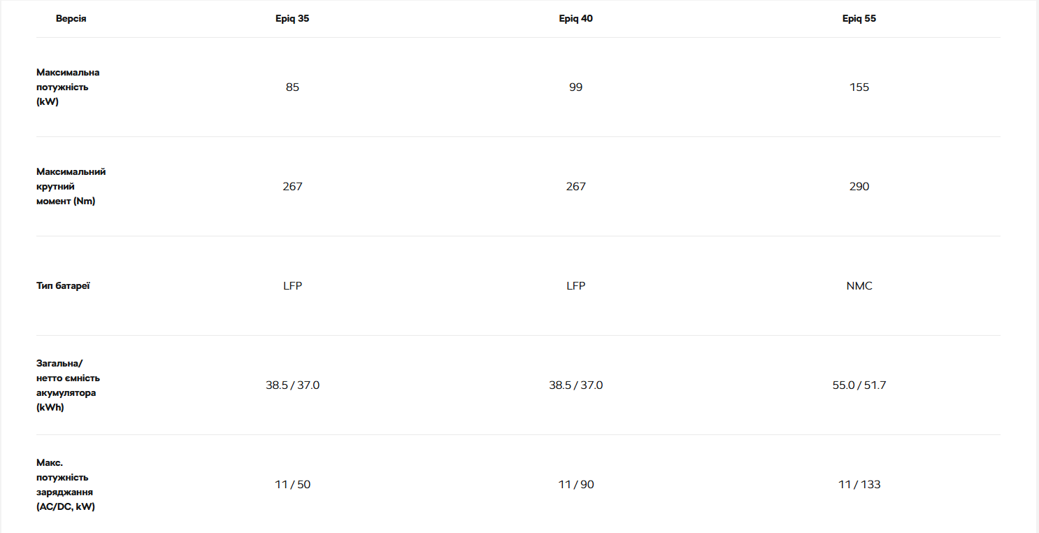 Автомобіль оснащений двома різними версіями нового електродвигуна APP290 у трьох варіантах потужності, поєднаних з двома різними тяговими батареями. Варіант Epiq 35 пропонує 85 кВт, тоді як потужніший Epiq 40 забезпечує 99 кВт, обидва в парі з батареєю загальною ємністю 38,5 кВт·год. Топова версія Epiq 55 пропонує 155 кВт з батареєю ємністю 55 кВт·год.