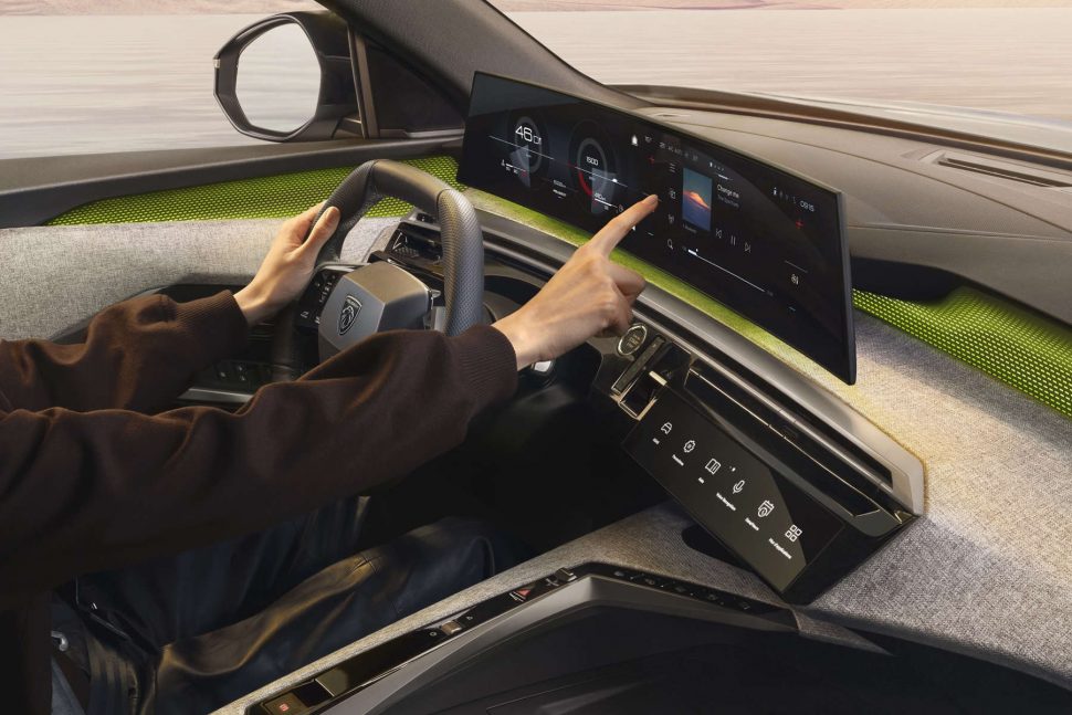 У салоні моделі сфокусована філософія бренду — створювати автомобілі, що дарують емоції з перших секунд. Водій опиняється у центрі вражаючого Panoramic i-Cockpit®: великий 21-дюймовий вигнутий дисплей наче парить над панеллю приладів завдяки прихованому LED-підсвічуванню. Він об’єднує цифрову панель приладів та центральний сенсорний екран у єдину суцільну HD-панель, вигнуту в бік водія для максимальної ергономіки. Таке рішення створює відчуття повної інтеграції у «цифровий світ автомобіля» та підкреслює футуристичний характер PEUGEOT.